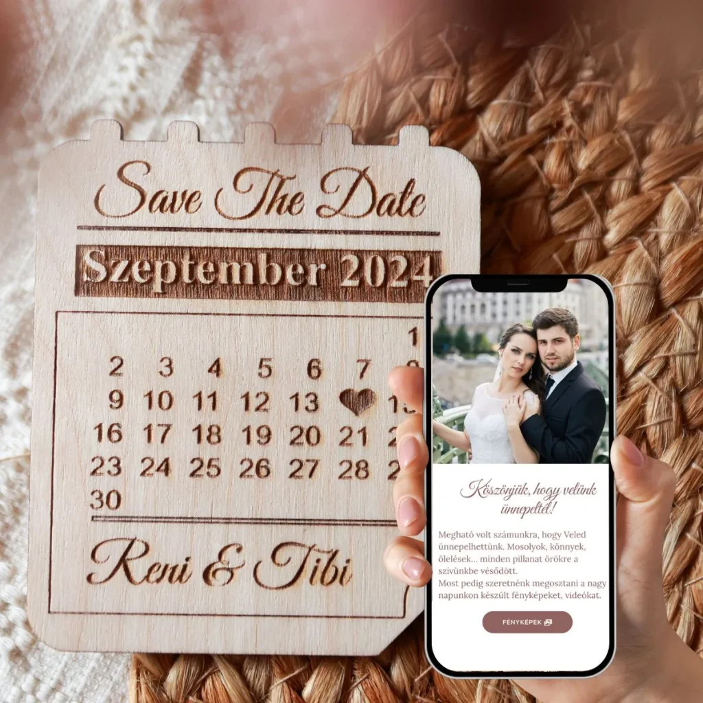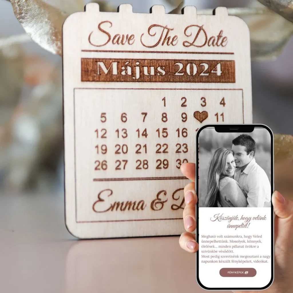 Most képzeld el, hogy minden vendég kezében ott van az egyedi gravírozású Save the Date naptár a Ti nevetekkel, esküvőtök dátumával. Hozzáérintik a telefonjukat és rögtön megnyílik az esküvői fotó- és videógalériátok.